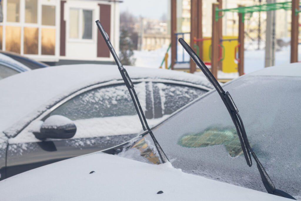 The wipers of the car are raised up so as not to freeze to the window glass in winter The wipers of the car are raised up so as not to freeze to the window glass in winter.